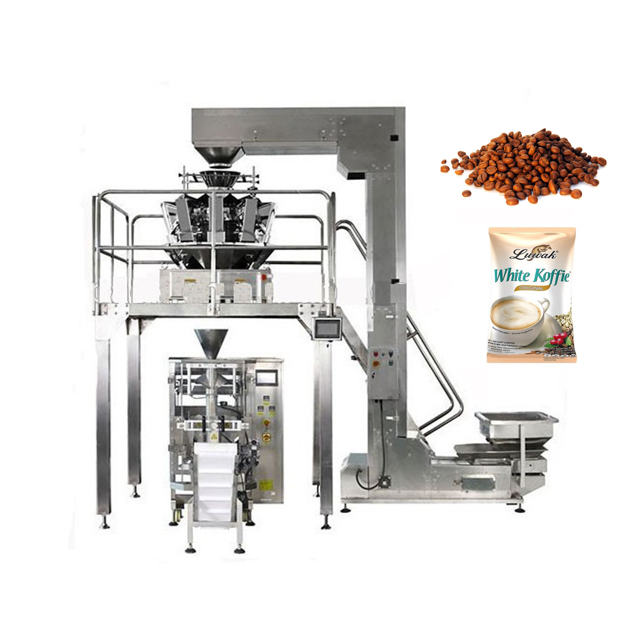 제품을 승강기에 공급하고, 그들을 다중 헤드 가중기로 운송합니다